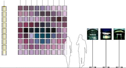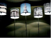 Installation aus 81 leuchtenden bedruckten Lampenschirmen, die als